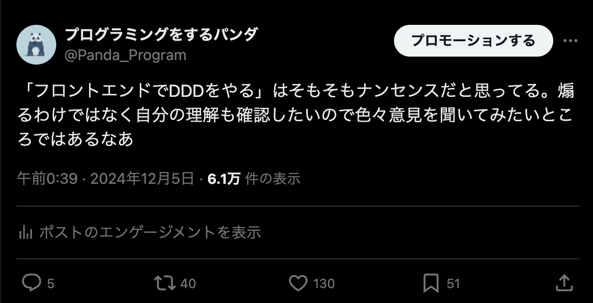 ソフトウェアエンジニア 3 年目あたりでクリーンアーキテクチャ本を読んだ時と、その後頻繁なプログラミング言語やフレームワーク、ライブラリのバージョンアップを間近で見ている今だと、重要なビジネスロジックを外部の変更から守ることの重要性に対する実感は全く異なります。そして 10 年以上フロントエンドで最前線を張っている弊社のテックリード曰く、「フロントエンドは全部置き換えられるから、ちゃんと作ったとしても結局は書き捨てに近い(だから適当に作っていいということではないけど、後生大事に守るという態度も違う)」とのことでした。
